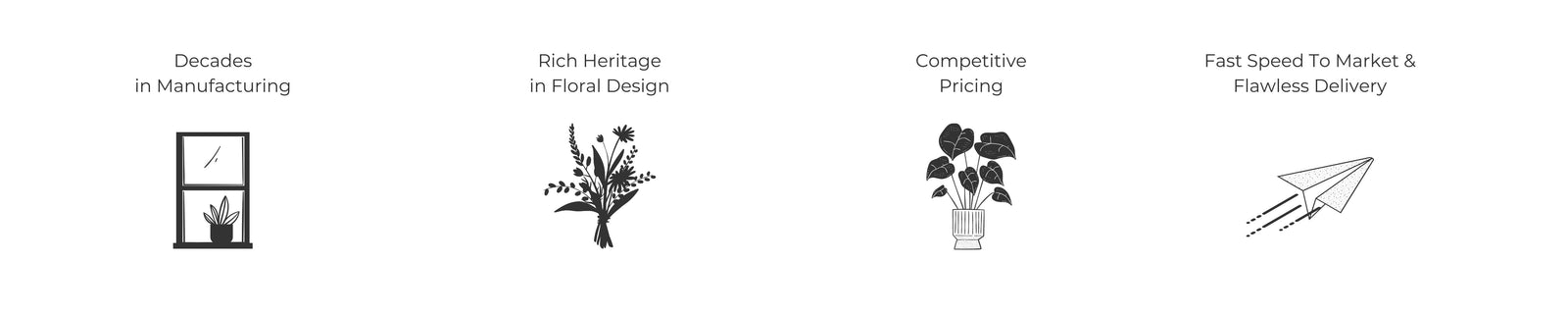 Combining our family-owned overseas production with our US floral manufacturing allows us to improve speed to market and reduce production costs. This ensures our products are aligned with our retail partner's merchandising strategies and allows us to create quality product at a value price.